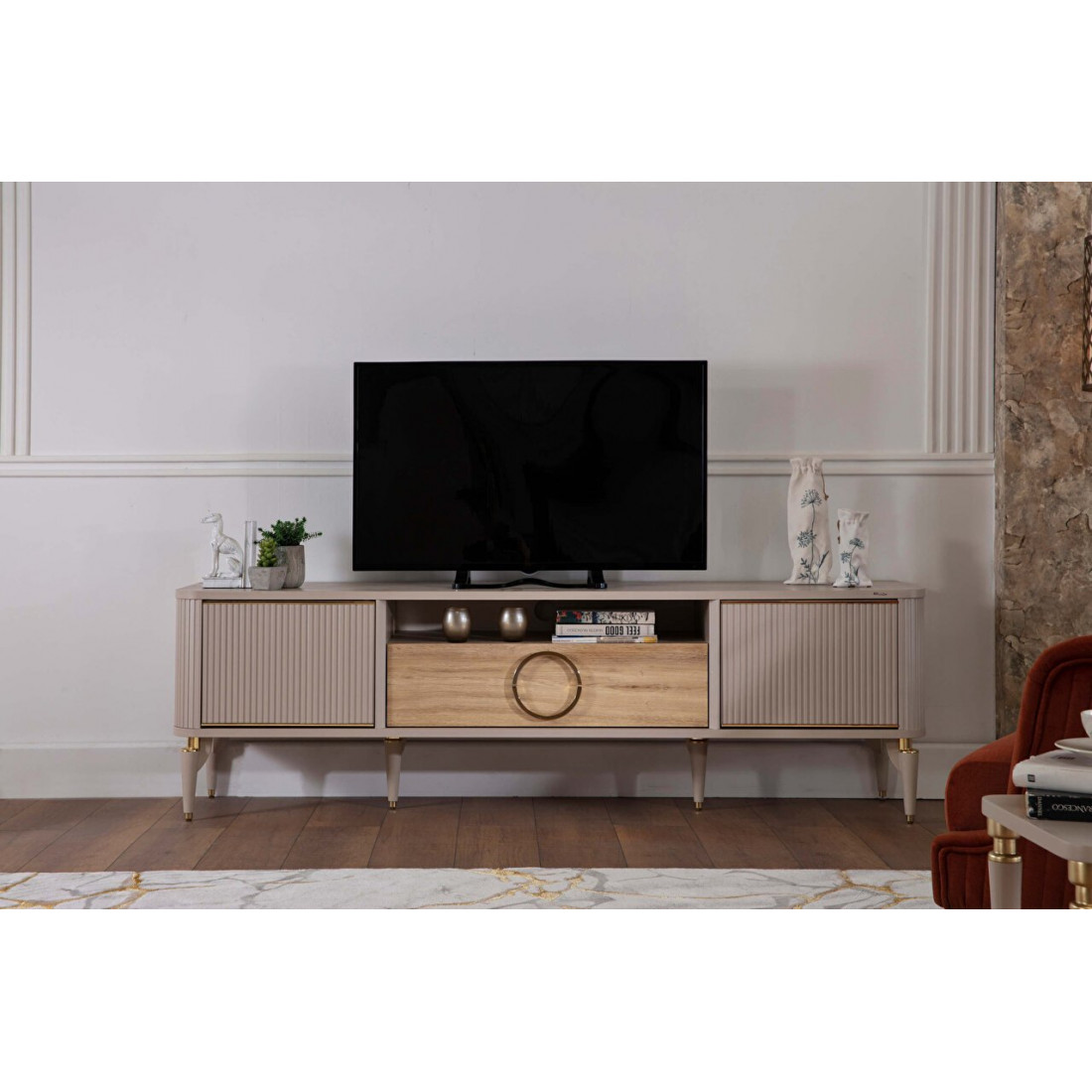 Тумба под ТВ Санвито SANVITO SANV-15  от турецкого производителя Bellona выполнена в современном стиле. Она отлично впишется в интерьер вашей гостиной. Позволит разместить большую плазму или домашний кинотеатр. Негромоздкая, утонченная по своему дизайну, тумба офрмлена в теплых, светлых тонах кремового оттенка в сочетании древесной фактуры. Боковые фасады декорированы по периметру золотой каймой, а центральный ящик круглой металлической ручкой. Как и другие элементы данной коллекции, кремовые фасады имеют рифленую поверхность, а уголки тумбочки закруглены.